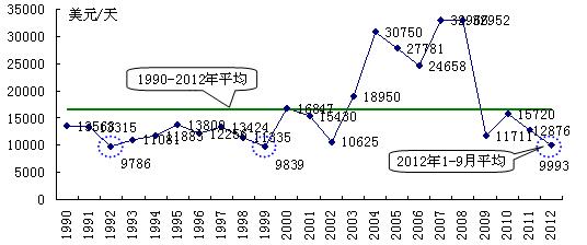 經(jīng)濟復蘇乏力或內(nèi)生動力不足直接對全球政治、軍事、民生、金融等產(chǎn)生極其不利影響,使從來沒清澈過的地球村變得更為渾濁,發(fā)展前景變得更為不確定性,對本已十分低迷的航運市場形成新的壓力與沖擊,直接把今年國際航運業(yè)拖入了歷史罕見的冰點。2012 年1-9月克拉克松航運綜合費率平均水平跌破1萬美元/天關(guān)口,與1992年和1999年水平相當;BDI平均點數(shù)下跌至907點,創(chuàng)出1999年以來的新低。