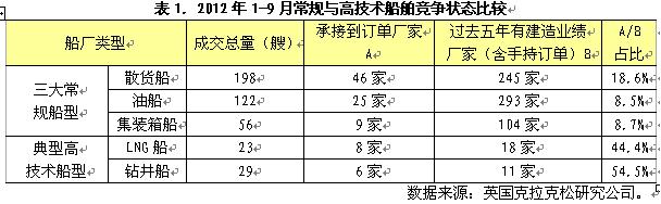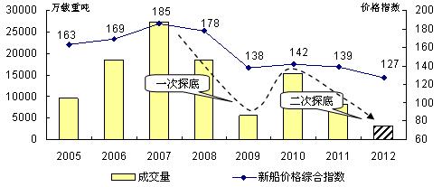 當人們欣喜看到2010年船舶市場“強勁復蘇”,寄希望2011年仍能保持這種態(tài)勢的時候,2011年世界經(jīng)濟、貿(mào)易、航運市場風云突變,船舶市場外部環(huán)境再度發(fā)生惡化,加上隱藏于船舶市場船舶產(chǎn)業(yè)深層次矛盾與問題的不斷暴露,船舶市場重返下行通道,2012年這種情況變得更為糟糕。按克拉克松公司統(tǒng)計,2012年1-9月全球累計成交新船訂單781艘、3230萬載重噸,月均360萬載重噸,較上一年月均成交量下滑46%,甚至比2009年月均水平(上次谷底)還低25%,呈典型“二次探底”之勢。隨著成交量的持續(xù)萎縮,新船價格進一步下滑,2012年9月底克拉克松新船價格指數(shù)報收于127點,較上年底下跌12點,并創(chuàng)下2008年價格下行以來的新低。