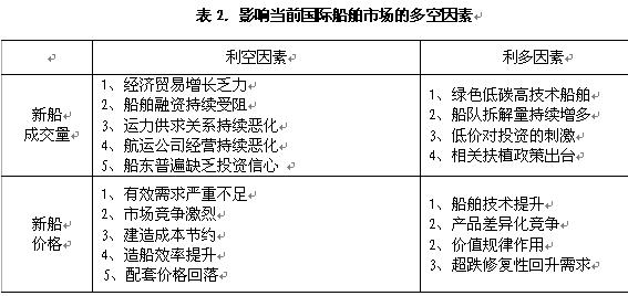 在外圍經(jīng)濟和航運市場環(huán)境再度惡化的情況下,年初以來國際船舶市場新船成交量和價格仍舊延續(xù)上年下跌態(tài)勢,但需求結(jié)構(gòu)變化仍為行情發(fā)展提供了新的機遇與氣象。從發(fā)展態(tài)勢來看,影響市場的消極因素仍然占據(jù)主導地位,短期內(nèi)蕭條的行情狀態(tài)不會發(fā)生根本變化,如果航運與造船市場能在今年完成充分觸底的話,來年行情定會出現(xiàn)修復性反彈(談不上“復蘇”),但不管市場好轉(zhuǎn)與否,滯后性決定船舶行業(yè)經(jīng)濟運行情況可能更為糟糕。