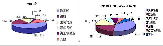 第一,2011年新船成交量再度大幅回落已成定局,細分船型市場輪動性進一步加強。按今年1-7月成交態(tài)勢測算,今年全年成交量大致在8000萬載重噸左右,較上一年下滑幅度極有可能超過40%。從細分船型市場發(fā)展而言,下半年散貨船市場總體上持續(xù)低迷;油船市場成交量可能會出現(xiàn)明顯改善;集裝箱船、液化氣船、大型海洋工程裝備產(chǎn)品以及個別特種船型在整個新造船市場中表現(xiàn)或作用將更加突出,但下半年這些細分市場行情可能較上半年有所遜色,應(yīng)引起大家關(guān)注。