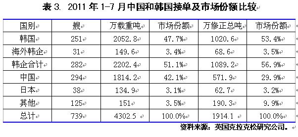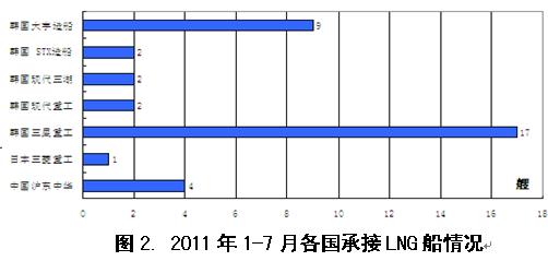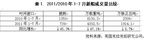 2011年1-7月國際造船市場新船需求總量同比出現(xiàn)大幅下滑,但需求結(jié)構(gòu)朝高技術(shù)高附加值船型轉(zhuǎn)變,受此影響,全球船舶市場競爭格局也發(fā)生顯著變化。從影響行情發(fā)展主要因素看,無論是經(jīng)濟發(fā)展、航運市場供求關(guān)系,還是船舶融資市場狀況,下半年出現(xiàn)明顯改觀的難度很大,船舶市場面臨形勢更加復(fù)雜嚴(yán)峻。