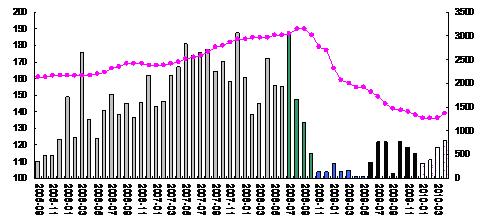• 年初以來造船市場(chǎng)充其量是2009年下半年行情的延續(xù),如果按上述水平推算,保守估計(jì)2010年全年成交水平將會(huì)達(dá)到6000萬載重噸左右。