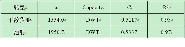 此基線公式由丹麥根據(jù)LR的Fairpiay中的數(shù)據(jù),結合當時初步EEDI計算方式,通過一定假設以Capacity為自變量,采用指數(shù)函數(shù)的形式向IMO組織提出。通過對現(xiàn)有船型的回歸分析,得出其相應的a和c的數(shù)值。