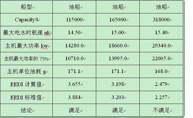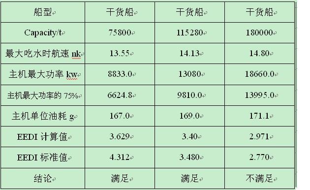 按EEDI的計算公式,對常規(guī)的三艘散貨船(75800t、115280t、180000t)進行計算結果DWT75800t散貨船符合要求有余度;DWT115280t散貨船符合要求無余度;DWT180000t散貨船不滿足要求(詳見附表1)。