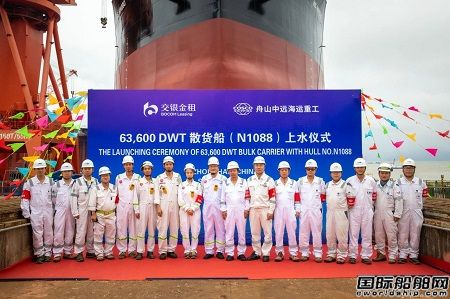 9月22日10點(diǎn)38分,舟山中遠(yuǎn)海運(yùn)重工為交銀金融租賃股份有限公司建造的63600噸系列散貨船第三艘船(N1088)在公司2號(hào)船臺(tái)順利上水。