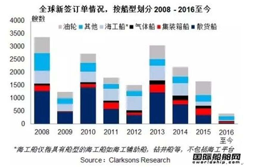 2016年全球新簽訂單量持續(xù)減少,前11個月僅有419艘合計2,609萬載重噸簽訂,以載重噸計同比下降75%。今年的訂單量預計將跌至上世紀80年代以來的最低水平。雖然2015年的訂單數(shù)量較前一年相比也下滑了約25%,但因為有大型油輪和集裝箱船訂單的支持,新訂單總量若以載重噸統(tǒng)計則相對穩(wěn)定。然而今年幾乎所有細分船型市場的新簽訂單量都出現(xiàn)了下跌。此外,新簽訂單量的減少也部分受到了環(huán)保規(guī)則規(guī)范的影響:IMO Tier III規(guī)則已于今年年初開始強制執(zhí)行,為了避免由滿足規(guī)范而產(chǎn)生的額外花費,一些新造船需求已經(jīng)在去年提前釋放。