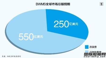相關(guān)分析機(jī)構(gòu)做出預(yù)測(cè)稱,《壓載水公約》生效后將給BWMS制造商帶來(lái)近800億美元的市場(chǎng)總量,對(duì)于BWMS這種船配市場(chǎng)的輕量級(jí)產(chǎn)品來(lái)說(shuō),這個(gè)數(shù)字是驚人的。另?yè)?jù)某投行交通事業(yè)部的進(jìn)一步分析,這塊800億美元的“大蛋糕”由占總比68.75%、總額達(dá)550億美元的設(shè)備購(gòu)置市場(chǎng)和占總比31.25%、總額達(dá)250億美元的改裝市場(chǎng)構(gòu)成(見圖1)。