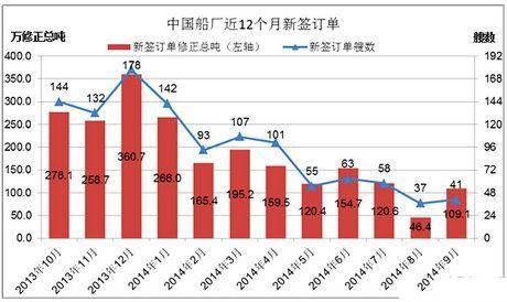 據(jù)克拉克松統(tǒng)計(jì),2014年9月,中國船廠新接訂單為41艘, 109.1萬CGT,環(huán)比上升了135.2%,同比下降了44.2%;近12個(gè)月,中國船廠的接單量呈先升后降的趨勢,2013年10月至2013年12月,接單量呈上升趨勢;2013年12月至2014年9月,接單量呈下降趨勢;2014年1至9月,中國船廠接單量為1320.5萬CGT,較2013年1至9月下降了16.9%。