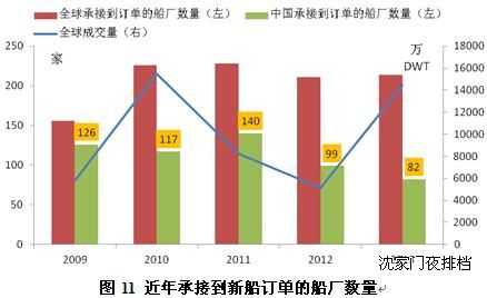 但中小型造船企業(yè)接單仍存在較大困難。盡管2013年全球新船成交量出現(xiàn)近2倍的增長,但全球承接到新船訂單的船廠數(shù)量卻與2012年基本持平。而中國船廠訂單承接總量增長了200%以上,但承接到訂單的船廠數(shù)量卻從2012年的99家減少到2013年的82家。這說明,盡管船舶市場出現(xiàn)大幅反彈,但受益者主要是大型造船企業(yè),中小船廠由于競爭力較弱,訂單承接依然困難。