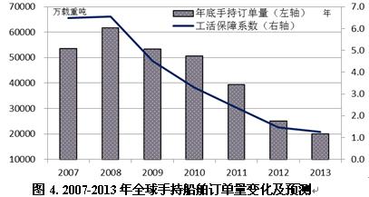 2013年度手持訂單量預(yù)測。按照上述預(yù)測,根據(jù)大致測算公司“期末手持訂單量=期初手持訂單量-期間造船完工量+期間新船訂單量-期間訂單撤銷量”,預(yù)計2012年底全球手持船舶訂單量降至2.5億載重噸,2013年可能進(jìn)一步跌破2億載重噸。全球造船業(yè)工活保障系數(shù)由2007年6.6年將跌至2012年底1.6年,2013年進(jìn)一步下滑至1.25年(以1.6億載重噸有效產(chǎn)能測算),預(yù)計2013年全球?qū)⒂懈嗟拇瑥S面臨無船開工的局面。