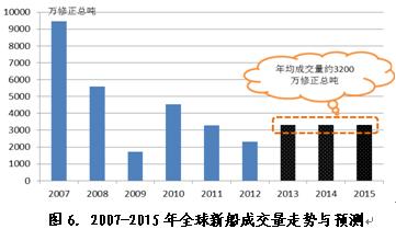 從新船需求來看,近幾年老舊船舶拆解強度顯著加大對“十二五”后三年行情會有很大促進(jìn)作用,預(yù)計2013-2015年期間年均需求預(yù)計約為3200萬修正總噸,其中,2013年成交量約為2960萬修正總噸,2014-2015年成交量有望進(jìn)一步放大到3500萬修正總噸左右。