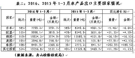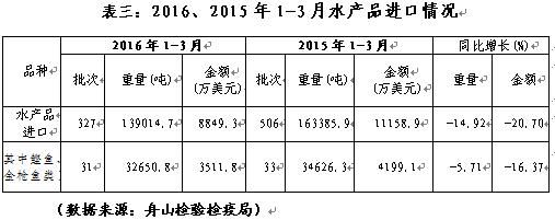 2016年1-3月舟山水產品進口下降,具體見表三:
