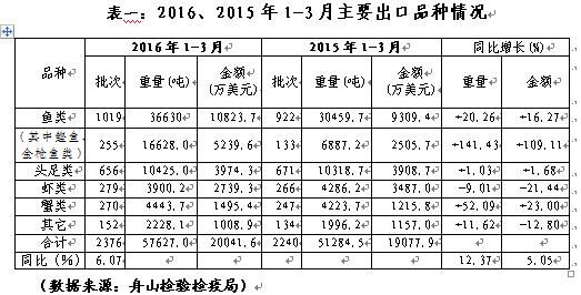 “十三五”規(guī)劃開局之年的開局之季,2016年1-3月舟山市水產品對外貿易迎來了開門紅,出口批次、出口量及出口額全線飄紅,一舉扭轉了2015年下降態(tài)勢。